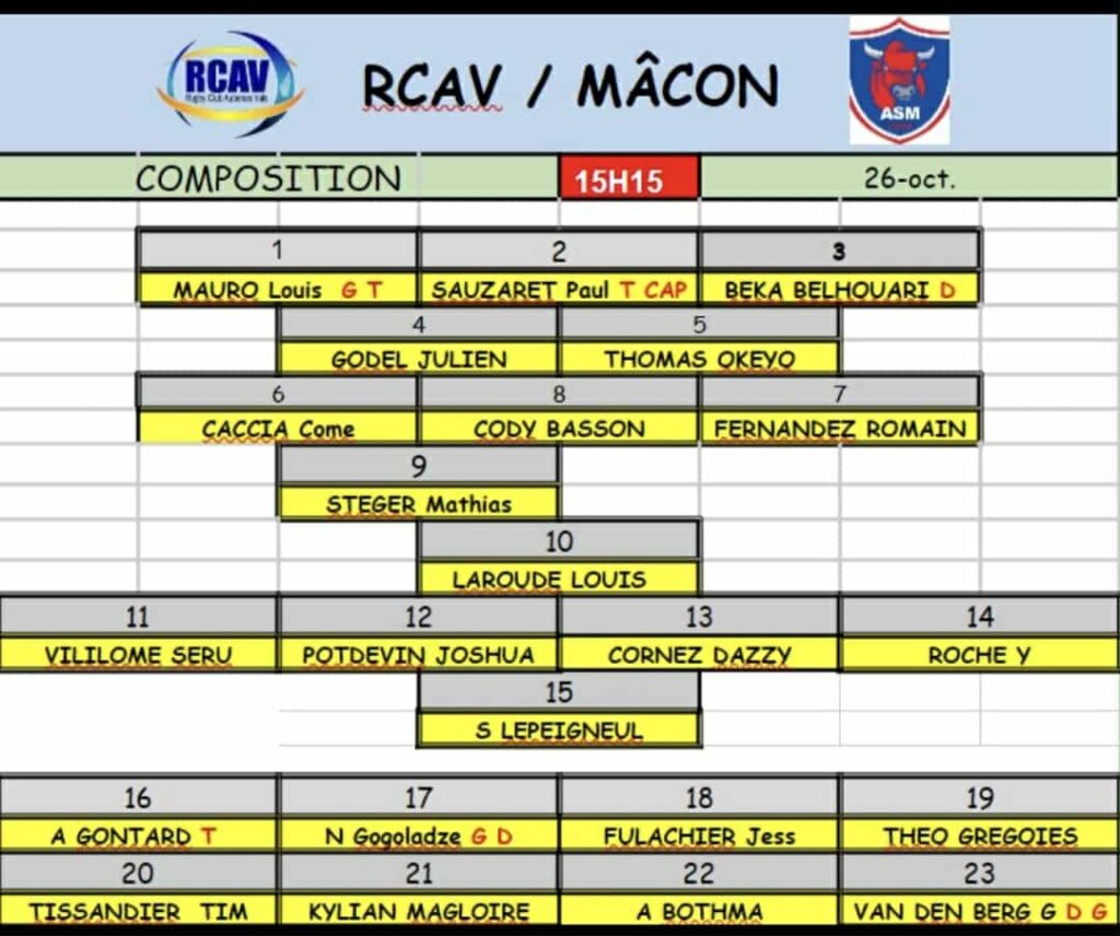 DIMANCHE 15 SEPTEMBRE 2024 STADE DUGRADUS A 13H30 RCAV ESPOIRS / STADE DIJONNAIS ESPOIRS VENEZ TRES NOMBREUX LES ENCOURAGER ET LES SOUTENIR ILS AURONT BESOIN DE VOUS ! UN NOUVEAU COMBAT ATTEND NOS ESPOIRS JAUNES ET BLEUS DANS L'ANTRE DE DUGRADUS LE XV DE DEPART 1 -...