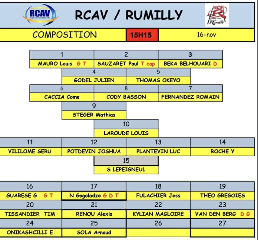 DIMANCHE 3 NOVEMBRE 2024 A 15H15 HUITIEME JOURNEE DE NATIONALE / SAISON 2024-2025 RCAV / SERVETTE RUGBY CLUB ALLEZ ALLEZ LES GARS ENVOYEZ LES COULEURS !!! ALLEZ ALLEZ JAUNES ET BLEUS / ENVOYEZ LES COULEURS VOICI LA COMPOSITION DU GROUPE PREMIER LE XV DE DEPART LES...