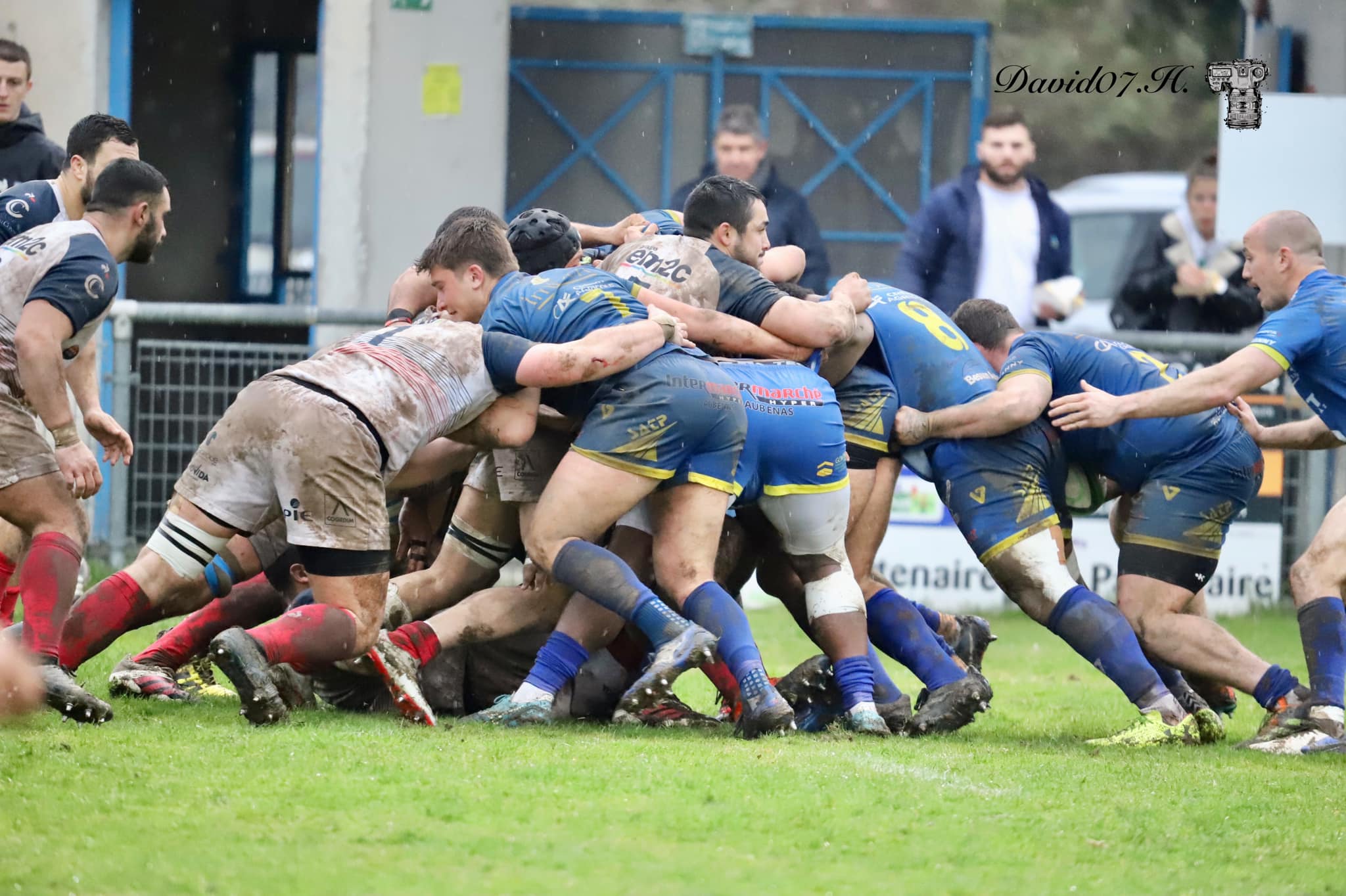 Sur une touche de Blagnac sur nos 22 m, la mêlée caoeuc avance. On est sanctionné.