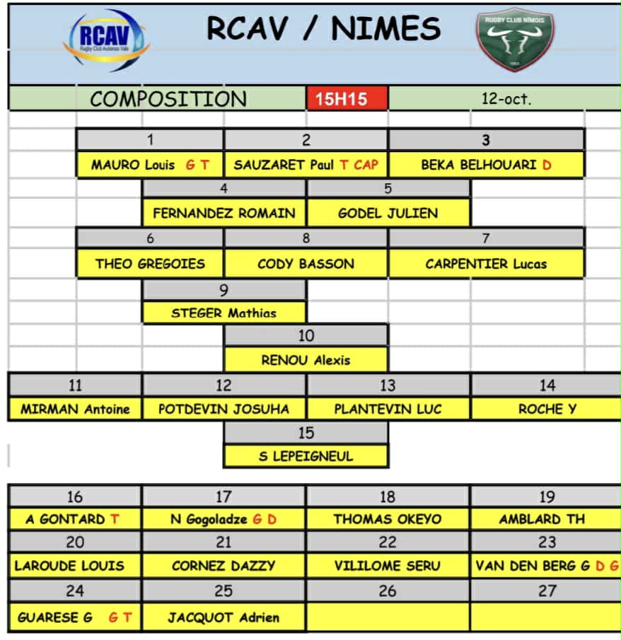 𝐂𝐎𝐌𝐏𝐎 𝐄𝐒𝐏𝐎𝐈𝐑𝐒 Découvrez la compo’ de nos espoirs Jaunes & Bleus pour cette deuxième confrontation face à Nîmes Stade Nicolas Kaufmann RC NIMES / RCAV. Coup d’envoi 17h15. ALLEZ ALLEZ JAUNE ET BLEU LE QUINZE DE DEPART 1 GALY Alexandre 2 VERNET Samuel 3...